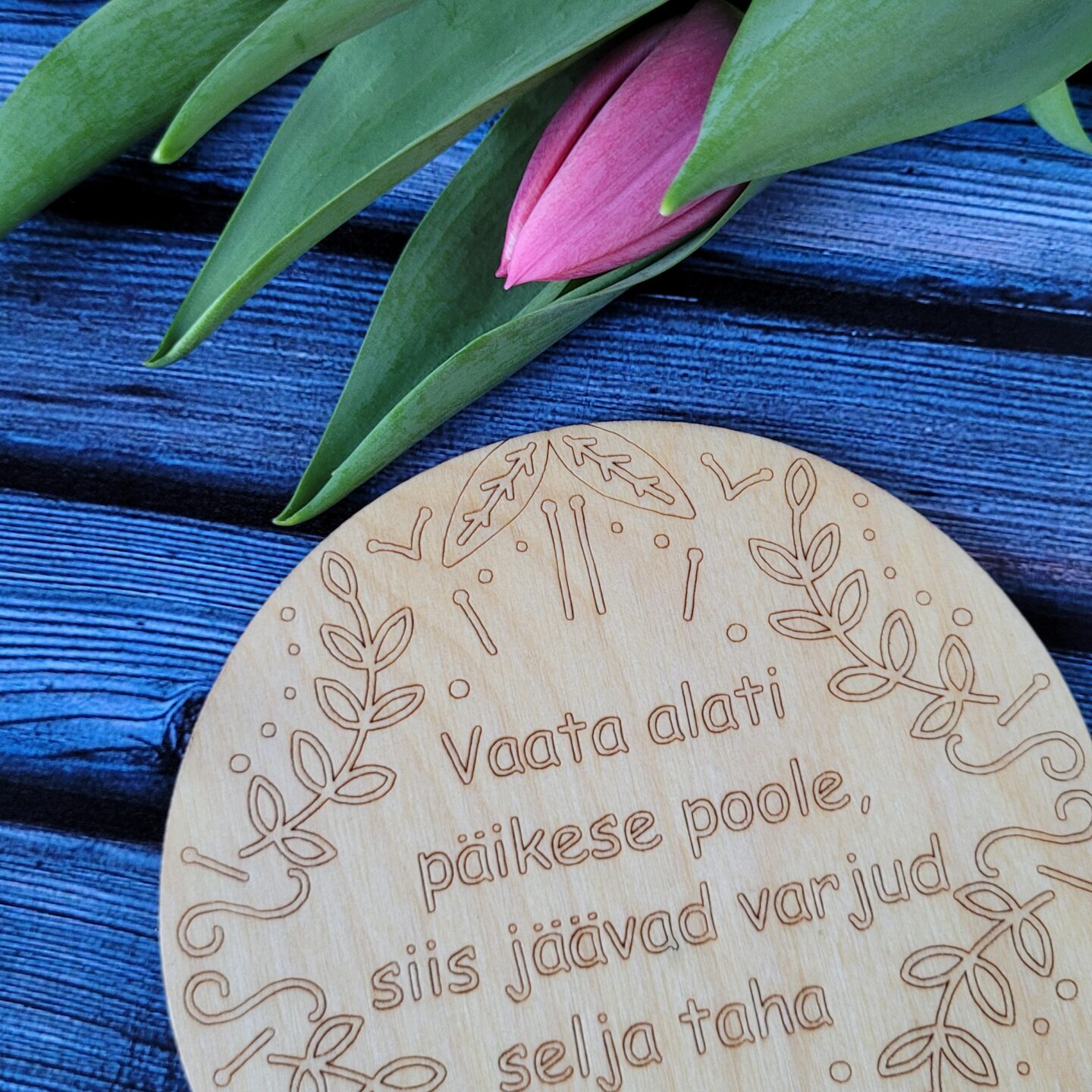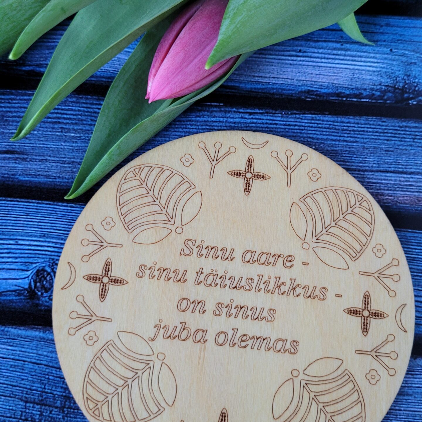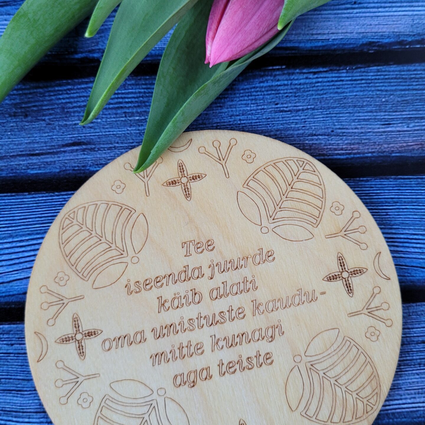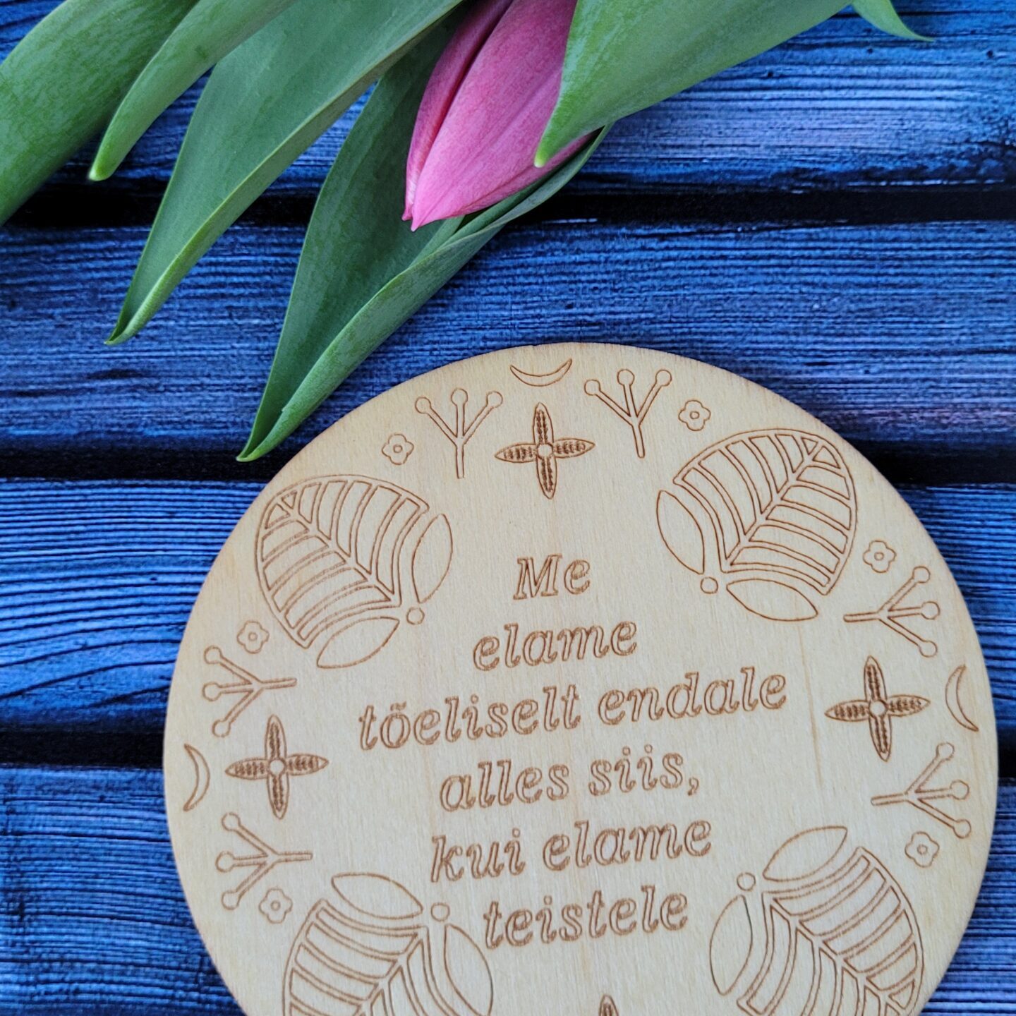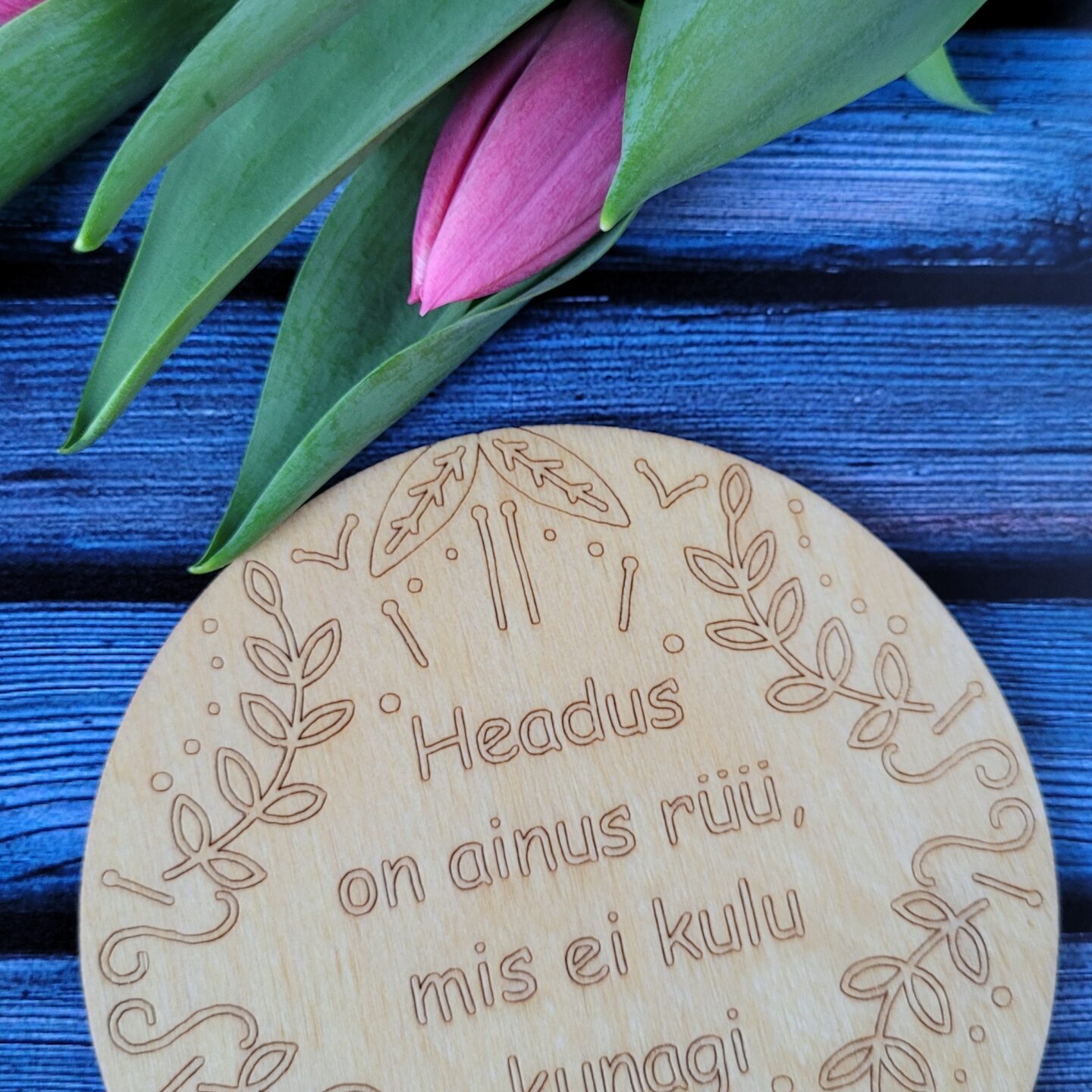 Erinevate sõnumitega tassialused. Tassialuse paksus on 3mm. Töödeldud loodusliku õliga. Edika laser Disain. Made in Estonia.