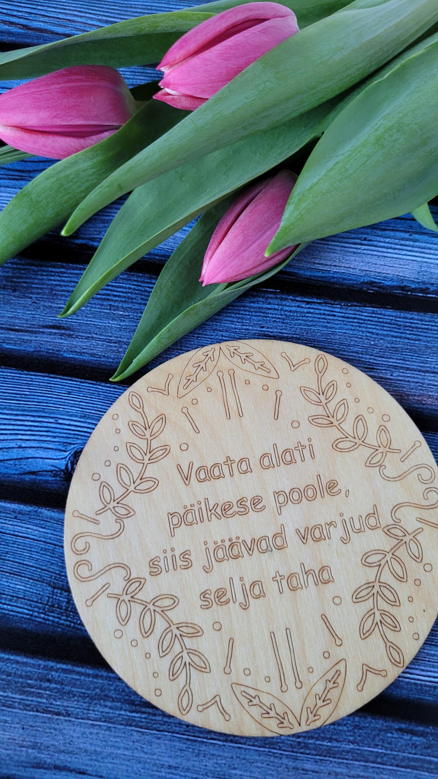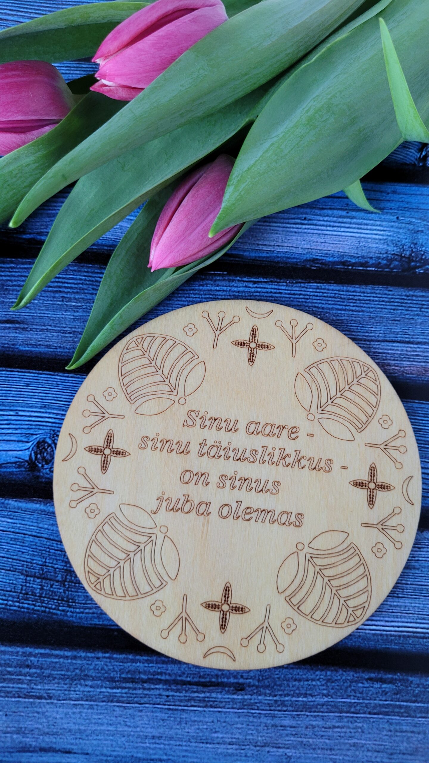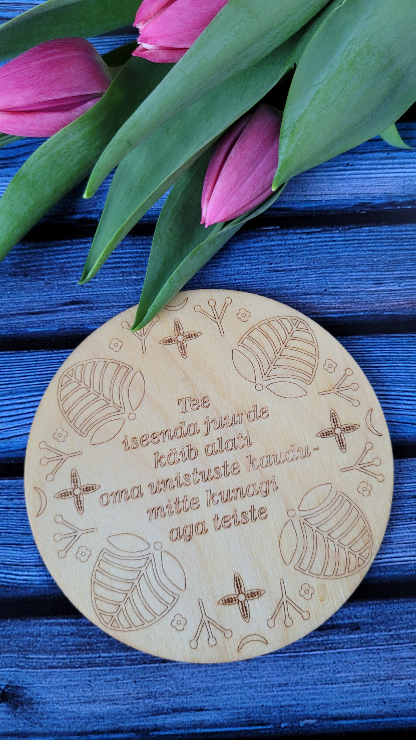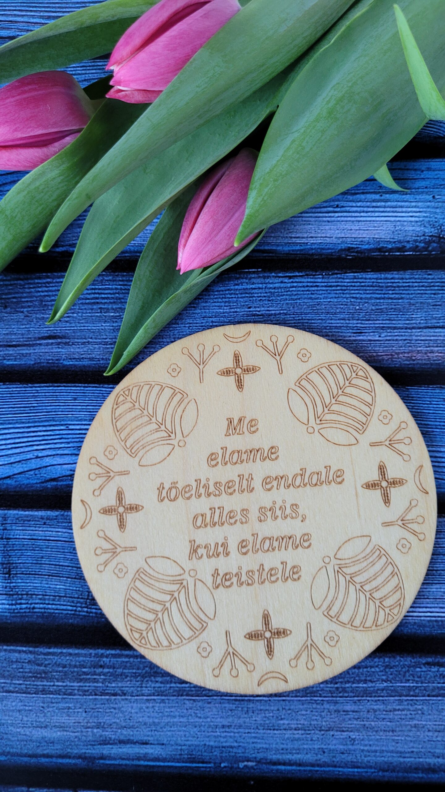 Erinevate sõnumitega tassialused. Tassialuse paksus on 3mm. Töödeldud loodusliku õliga. Edika laser Disain. Made in Estonia.